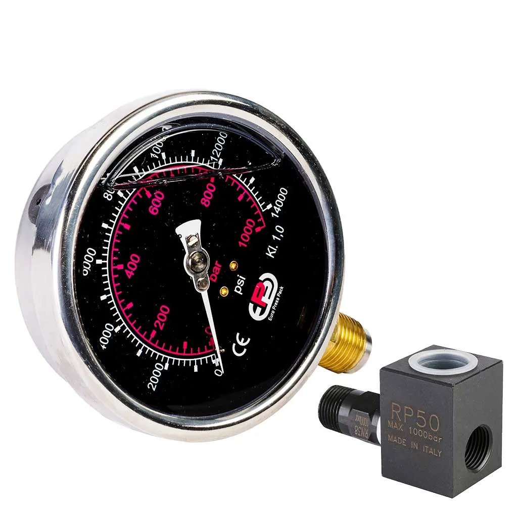They are available with 63 or 100 mm diameter dial with bar and PSI. The 1000 bar gauges are glycerine filled while the 1600, 3000, 4000 bar are dry. The G106L pressure gauge has a 1/4” NPT screw connection for direct insertion on the left side of the pump head. The model G10 exists also in the double scale version, bar and kN, to be used up to 700 bar, and differenciated for cylinders with hollow piston (G10F##) and for cylinders with normal piston (G10S##).