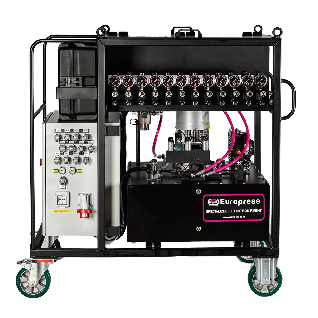 Electronic control base (8 points) with dedicated PLC + note book with included software (Windows area) to display and control operations and to book data + 8 linear stroke transducers (1 for each lifting point) + group of control valves + trolley + cover |