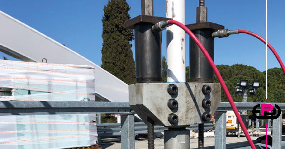 I cilindri forati CMF sono stati posizionati in corrispondenza dei punti di ancoraggio, fungendo da guida e contenitore dei trefoli dei tiranti. Le pompe PN ad alta pressione hanno garantito l’inserimento dei tiranti e la messa in tensione controllata dei trefoli stessi, rispettando le tolleranze previste dal progetto. Questo sistema ha permesso di trasmettere e regolare con precisione la forza di precompressione necessaria a vincolare l’impalcato agli archi portanti.