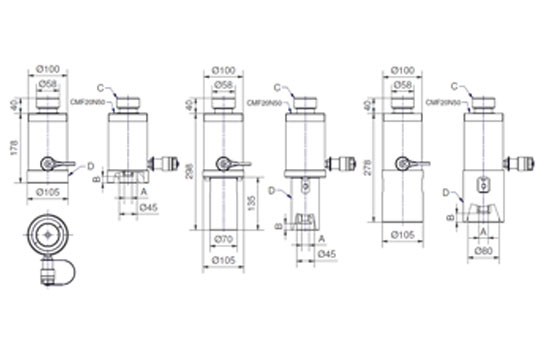 Il sistema si compone in primo luogo da un cilindro forato a semplice effetto, ritorno a molla, modello CMF20N50 avente capacità nominale massima di 230 kN a 700 bar, corsa 50 mm dotato di un giunto rapido femmina di accoppiamento ad una pompa con manometro (certificabile) come fonte di pressione oleodinamica. Questo cilindro costituisce un mezzo di misura della forza applicata al prigioniero in collaudo.